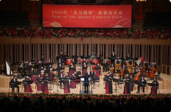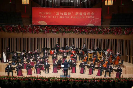 在农历马年奏响的《战马奔腾》,四位二胡演奏家以“大击弓”等高超技艺,生动再现了万马奔腾的壮阔场景,寓意新年奋勇向前、昂扬奋进;《紫禁三和》则以音乐为笔,勾勒出故宫的壮美轮廓与深厚文化底蕴,传递出坚定的文化自信;而打击乐领奏的《龙腾虎跃》更是将全场气氛推向高潮,以铿锵澎湃的节奏,烘托欢腾景象,彰显中华民族昂扬奋进的时代姿态。